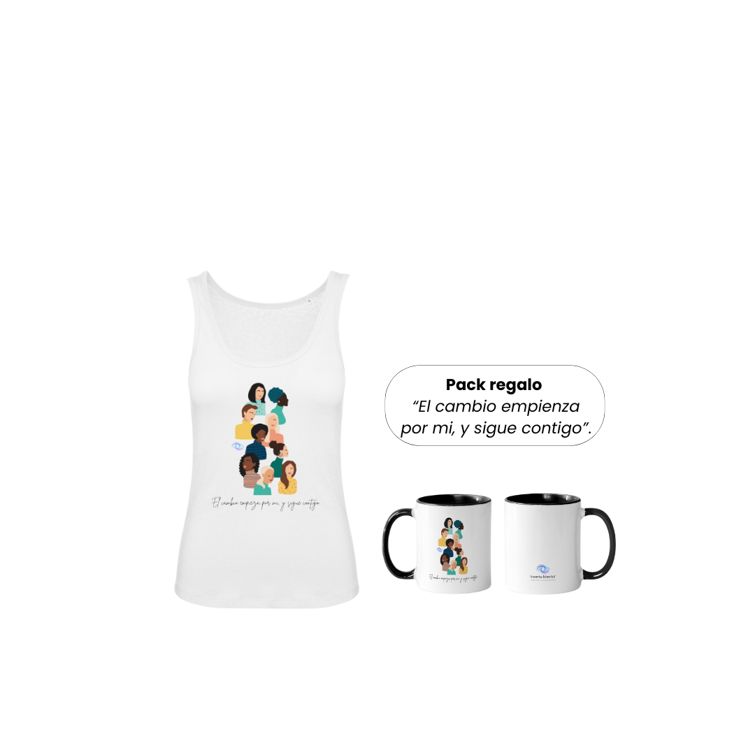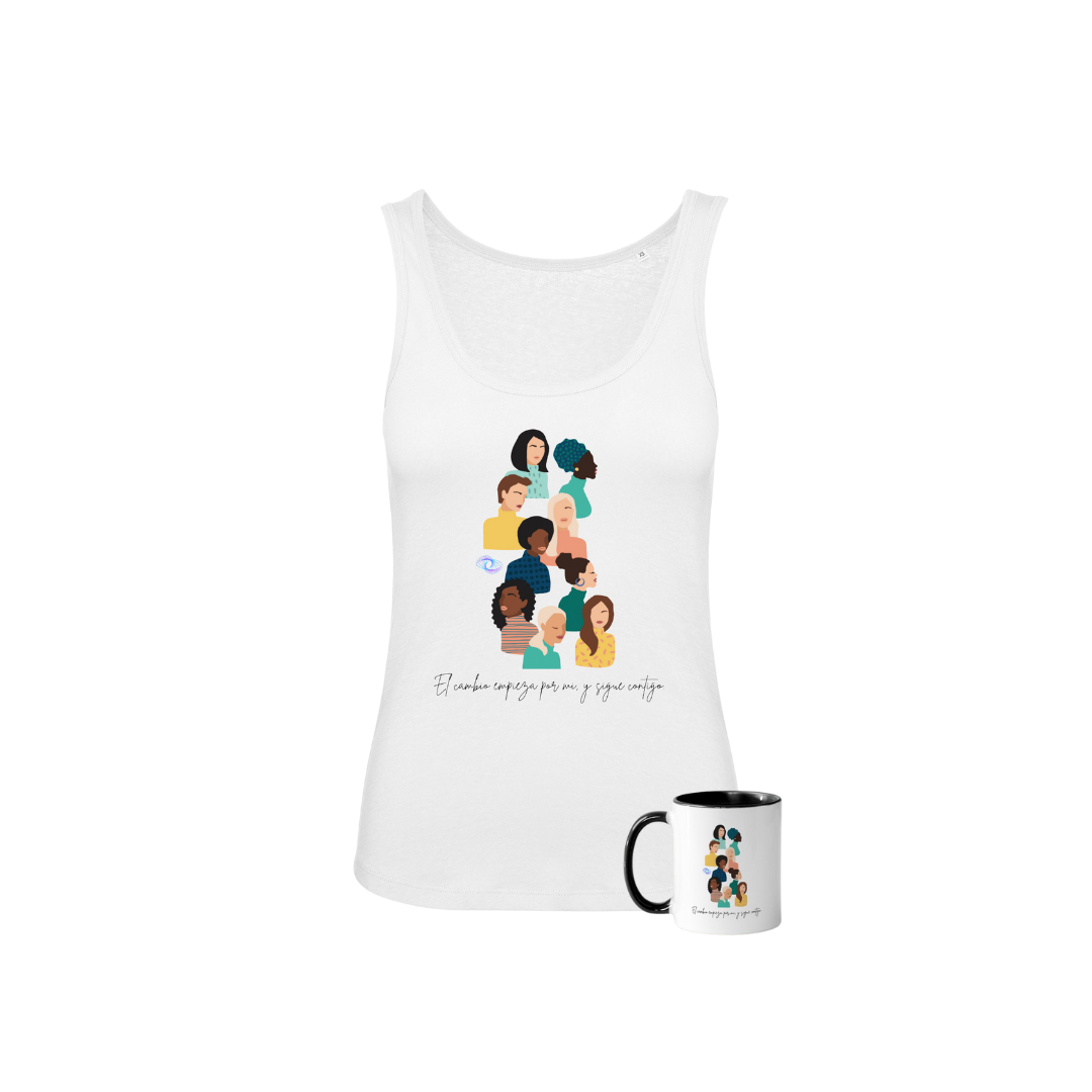 Este pack especial, compuesto por una camiseta de tirantes y una taza, celebra la diversidad y el poder transformador de las mujeres. Con un diseño que reúne a nueve mujeres de diferentes culturas, edades y razas, transmite un mensaje de unidad e impacto colectivo. Es perfecto para quienes creen en la fuerza del cambio que comienza en uno mismo y se expande hacia los demás. ¡Una inspiración para llevar y compartir! Camiseta: 100% algodón orgánico. Tallas desde XS a 2XL. Capacidad taza: 325ml. Cerámica resistente. Entrega en 2 semanas.