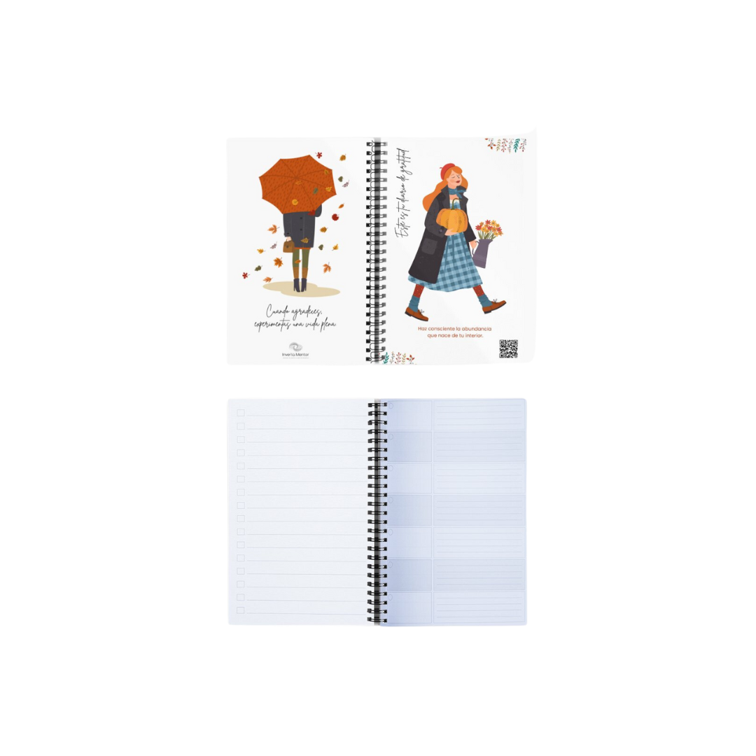 Este mini diario de gratitud es un refugio para tus pensamientos y un recordatorio de la abundancia que vive en ti. Con ilustraciones que transmiten alegría y serenidad, su portada muestra a una mujer caminando entre flores con una calabaza en mano, y en la contraportada, resguardada bajo un paraguas. Está diseñado para ayudarte a reflexionar y conectar con los pequeños grandes regalos de la vida. Hemos distribuido las hojas por semanas para que apuntes lo más importante de cada día y recibirás un paquete con pegatinas diarias para que puedas organizarte mucho mejor. ¡Empieza tu viaje hacia una mente más agradecida y plena! 80 páginas. Tamaño: 139 x 216 mm. Encuadernación en espiral. Entrega en 2 semanas. Paquete de pegatinas diarias incluido.
